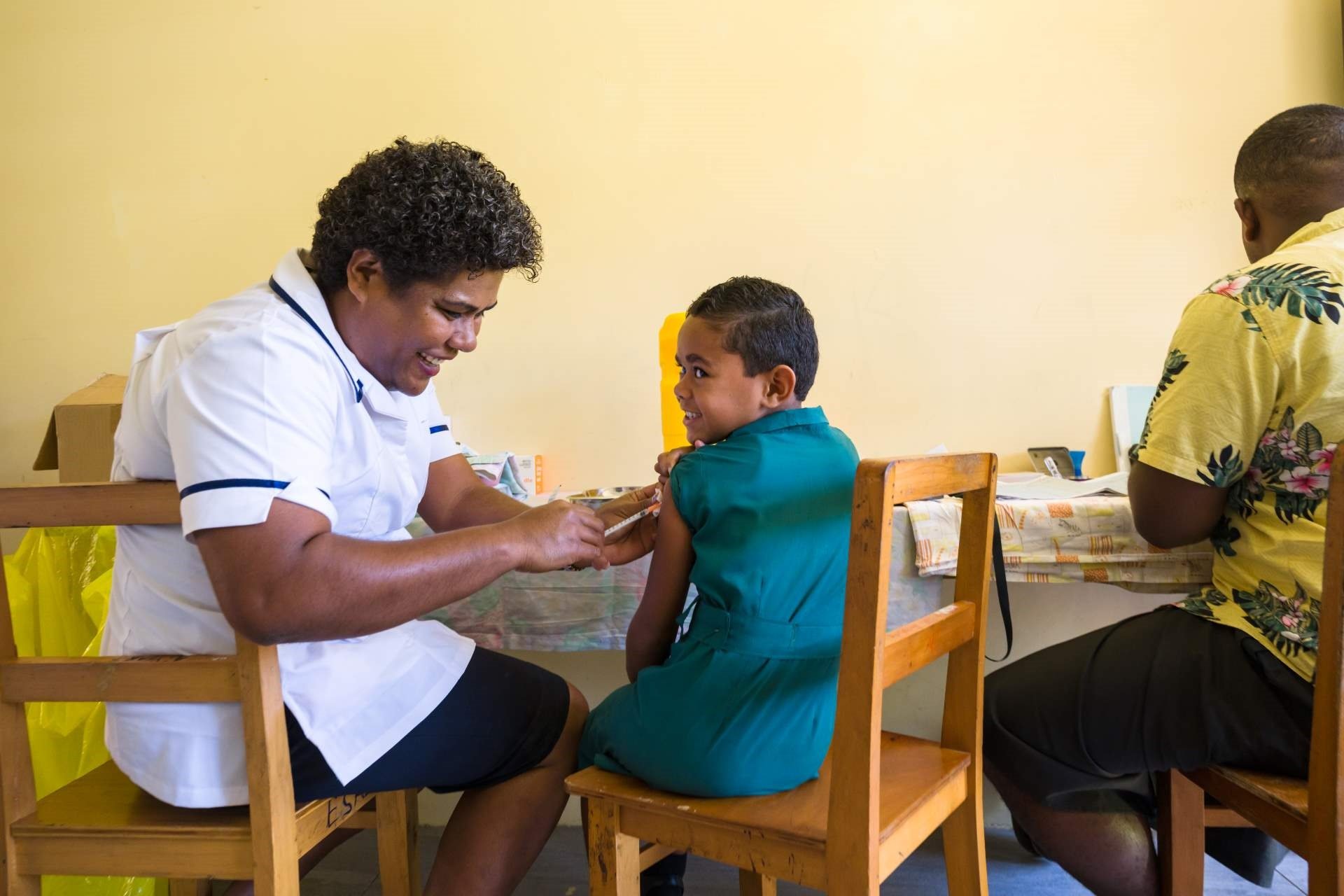 6-year-old Esita receives her second dose of COVID-19 vaccine from Zone Nurse Jotivini Tisaru during the COVID-19 school vaccination outreach in Fiji.
